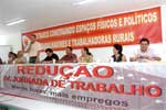 A CUT Ceará realizou no último dia 22/11 o seminário “Redução da jornada de trabalho – mais e melhores empregos”. Como principal debatedor foi convidado o presidente da CUT nacional Artur Henrique, mas o evento contou ainda com a participação do coordenador do Instituto de Desenvolvimento do Trabalho (IDT), Diassis Diniz, do coordenador do Dieese/CE, Reginaldo Aguiar e de diversos sindicatos de trabalhadores, além de servidores municipais de todo o Estado, representantes da Fetamce, Fetraece, entre outras entidades.