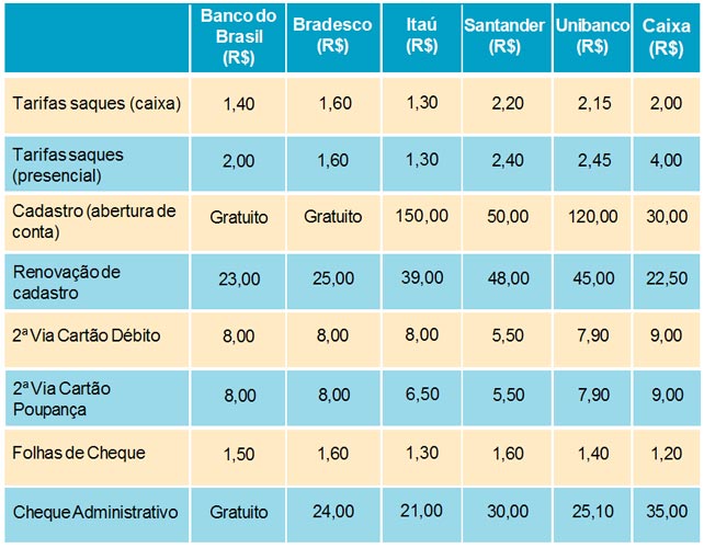 Desde o dia 31/3, os bancos brasileiros devem divulgar em suas agências e sites na internet a nova tabela de tarifas bancárias para pessoas físicas, já adaptada às normas definidas pelo Banco Central (BC) em dezembro passado, que limitam a 20 o número de serviços que podem ser cobrados, padronizam o nome desses serviços em todas as instituições e ampliam os gratuitos.