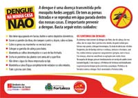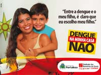 O folder traz um apelo às donas de casa para que não deixem o mosquito Aedes aegypti se proliferar. Com o título “Entre a dengue e o meu filho, é claro que eu escolho meu filho”, a campanha mostra às mães que é possível evitar a epidemia da doença seguindo alguns cuidados, como colocar as garrafas de cabeça para baixo, manter a caixa d’água completamente vedada, escovar as paredes de tanques e potes, entre outros.