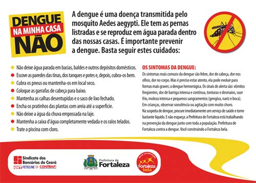 O Sindicato dos Bancários do Ceará (SEEB/CE), em parceira com a Secretaria de Saúde do Município, está lançando um folheto explicativo sobre a dengue. O material está encartado nesta edição da Tribuna Bancária.