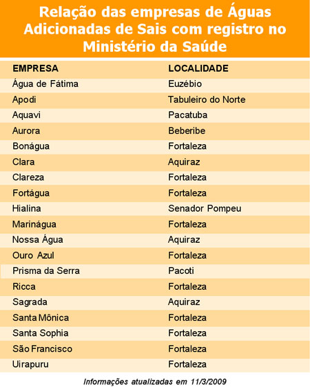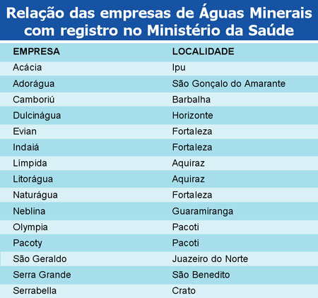 Atualmente, trinta e quatro empresas estão autorizadas a revenderem água no território cearense (ver quadro). Porém, de acordo com a responsável técnica pelo setor de produto da vigilância sanitária da Secretaria de Saúde do Estado, Lúcia Sales, a legislação de 1999 permitiu a proliferação de empresas clandestinas, já que com a lei foi autorizada a produção de água purificada de sais. Enquanto as águas minerais passam pela vistoria da Agência Nacional de Vigilância Sanitária (Anvisa) e do Departamento Nacional de Produção Mineral (DNPM), que envolve um processo longo e complicado, as águas com sais são verificadas apenas pela Anvisa.