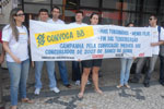 CONCURSADOS NO ATO – Durante a manifestação da Campanha Salarial realizada na quinta-feira, dia 10/9, pelos bancários do Banco do Brasil e dirigentes do Sindicato dos Bancários do Ceará, na agência Barão do Rio Branco, no Centro de Fortaleza, os concursos do BB, que ainda não foram chamados, aproveitaram para fazer protestos e exigir suas convocações. |