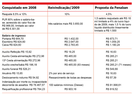O Comando Nacional dos Bancários rejeitou, já na mesa de negociação, a proposta apresentada pela Fenaban no dia 17/9, uma vez que ela não contempla as principais reivindicações da categoria. Os bancos propuseram a reposição da inflação (4,5% de reajuste), uma PLR inferior à do ano passado, nenhuma valorização dos pisos salariais e nem proteção aos empregos. Eles também negaram auxílio-educação e querem reduzir o auxílio-creche/babá de 83 para 71 meses.