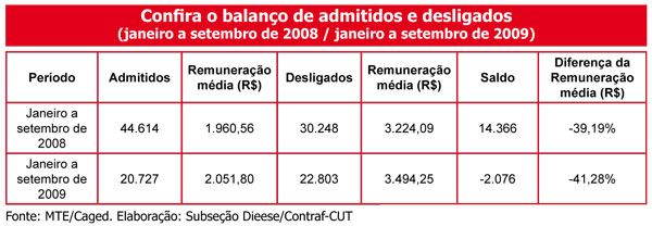 DEMISSÕES SE CONCENTRAM NOS MAIORES SALÁRIOS – Além da redução do emprego, está havendo também uma diminuição na remuneração média dos trabalhadores do sistema financeiro. Os desligados de janeiro a setembro de 2009 recebiam remuneração média de R$ 3.494,25. Já os contratados têm remuneração média de R$ 2.051,80, o que representa uma diferença de 41,28% - quase a metade.