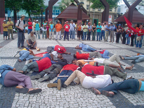 Para lembrar os 10 anos do massacre em Eldorado do Carajás, militantes do Movimento dos Trabalhadores Rurais Sem Terra (MST) fizeram uma manifestação na Praça do Ferreira, na segunda-feira, 17/4, cobrando justiça e o fim da impunidade. O protesto contou com a presença de parlamentares, movimentos populares e sindicatos. O MST, durante várias horas lembrou as vítimas do massacre com cruzes e trabalhadores estendidos no meio da praça para simbolizar os 19 mortos de Eldorado dos Carajás (PA), em 1996.