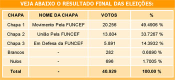 A Chapa 1 – Movimento na Funcef venceu as eleições do Fundo de Pensão dos empregados da Caixa com mais de 49% do total de votos. O pleito terminou na última quarta-feira, 31/5 e contou com a participação de 40.929 associados.