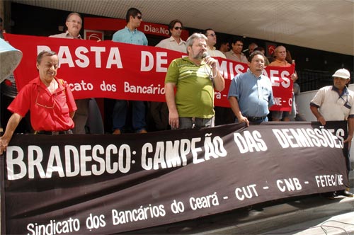 “Na hora de lucrar, o Bradesco exige metas e horários absurdos. As metas ocasionam as demissões. Só no processo de privatização, saíram 700 bancários. Agora, mais 100”, denunciou Robério Ximenes, funcionário do Bradesco/BEC e diretor do Sindicato. O presidente do SEEB/CE, Marcos Saraiva, acrescentou que, além dos demitidos, há funcionários pedindo demissão por falta de condições de trabalho e devido ao assédio moral que estão sofrendo.