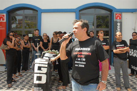 Um enterro simbólico do emprego no Bradesco ocorreu, na sexta-feira, dia 26/1, na agência da Santos Dumont. Do lado de fora, os diretores do Sindicato dos Bancários denunciaram as demissões no banco. Para esta semana, quatro demissões de funcionários do Bradesco deram entrada no setor Jurídico do Sindicato, para homologações. Em 2006, foram 152 demissões só no Ceará.