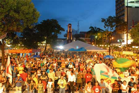 Os trabalhadores foram à Praça reivindicar o desenvolvimento com distribuição de renda e valorização do trabalho, além de se manifestarem contra a Emenda 3. Durante todo o ato cantores da terra fizeram apresentações e no encerramento houve um show com o cantor Geraldo Azevedo.