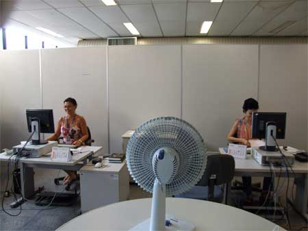 Os funcionários improvisaram alguns ventiladores, trazidos de casa mesmo, mas são insuficientes para diminuir o enorme calor do ambiente. Há três semanas a central de ar está totalmente desligada. Várias reclamações foram feitas à Superintendência, mas sem solução.